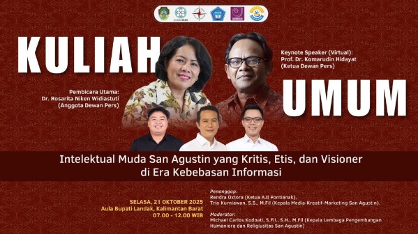 Pena Katolik, Ngabang, 21 Oktober 2025 |  Universitas Katolik Santo Agustinus Hippo menyelenggarakan Kuliah Umum Tahun Akademik 2025/2026 dengan tema “Intelektual Muda San Agustin yang Kritis, Etis, dan Visioner di Era Kebebasan Informasi”, bertempat di Aula Kantor Bupati Landak, dengan format hybrid yang melibatkan mahasiswa, dosen, dan tenaga kependidikan dari tiga kampus Unika Santo Agustinus Hippo.