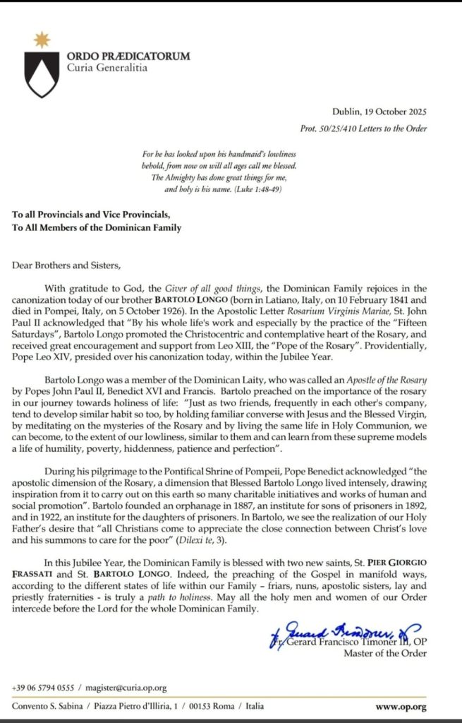 “Dengan penuh syukur kepada Allah, Sang Pemberi segala yang baik, Keluarga Dominikan bersukacita atas kanonisasi saudara kita, Bartolo Longo.”