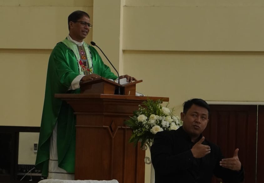 Penerjemah Bahasa Isyarat berdiri di samping depan altar, memastikan umat yang tuli dapat mengikuti setiap doa, bacaan, dan homili.