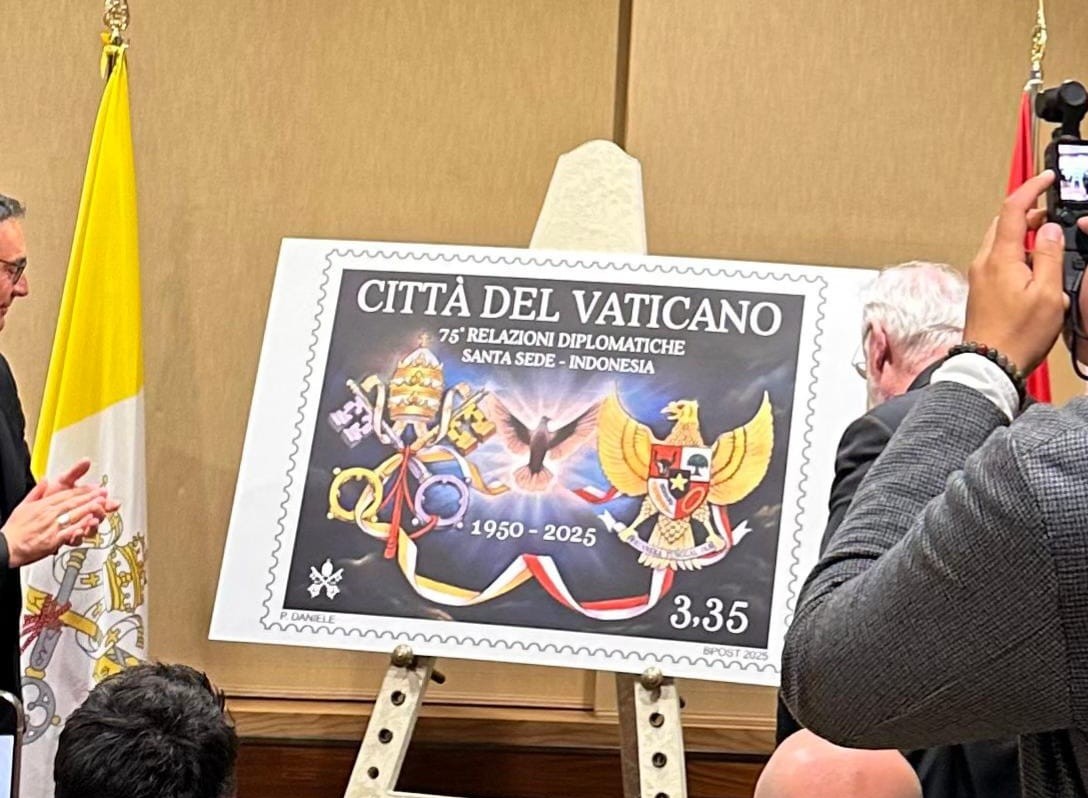 Di bagian atas ada tulisan “CITTA DEL VATICANO” (Negara Kota Vatikan). Dan, di bawahnya ada tulisan “75 Relazioni Diplomatiche Santa Sede – Indonesia” (75 tahun Hubungan Diplomatik Takhta Suci – Indonesia). Perangko baru itu bernilai 3,35 Euro.