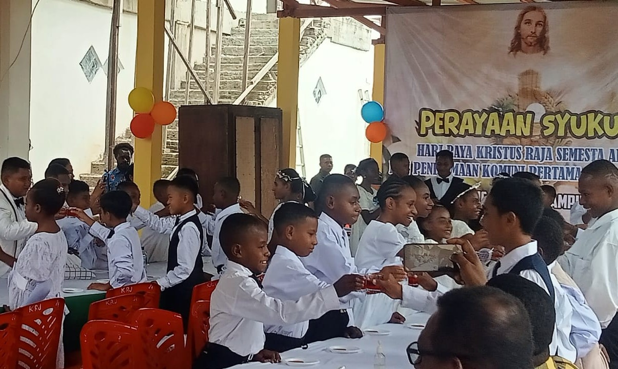 MERAUKE, Merauke, 23 November 2025 — Suasana penuh sukacita menyelimuti Paroki Sang Penebus Kampung Baru, Keuskupan Agung Merauke, saat 49 anak menerima Komuni Pertama bertepatan dengan Hari Raya Kristus Raja Semesta Alam. Perayaan Ekaristi dipimpin oleh Romo Christofel Feddy Andris MSC, yang menyampaikan terima kasih atas kesediaan anak-anak menerima Sakramen Mahakudus di hadapan umat. Ia menegaskan bahwa proses panjang telah dilalui: mulai dari pendaftaran melalui ketua lingkungan, pembinaan oleh guru agama, pengumuman di gereja, hingga pengakuan dosa bersama orang tua.
