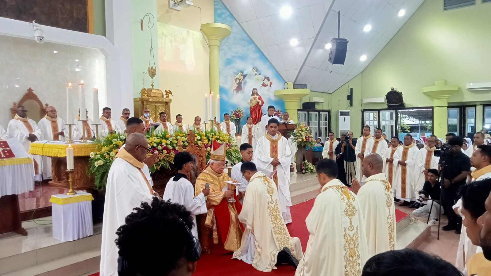 MERAUKE, Pena Katolik – Uskup Agung Merauke, Mgr. Petrus Canisius Mandagi, MSC, menahbiskan tiga imam baru dalam Perayaan Ekaristi di Gereja Katedral St. Fransiskus Xaverius Merauke, Sabtu, 31 Januari 2026. Mereka adalah Romo Agustinus Nicolaus Yokit, MSC; Romo Gregorius Helyanan; dan Romo Yohanis Ngaga Mbira Lando, MSC.