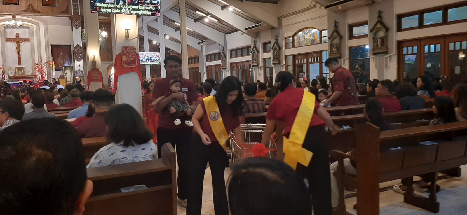 Di dalam Gereja, keceriaan terpancar dari wajah anak-anak saat mereka menerima berkat dari Pastor dan mendapatkan angpau. Sementara itu, ratusan umat yang hadir menerima bingkisan khas berupa kue keranjang, permen, dan manisan.